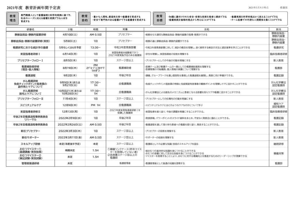 看護という専門職を選択したあとも、業務スキルの習得や人間関係などで挫けることもあるかもしれません。しかし、些細なことでも楽しいことが見つかり、小さくても目標が見つけられれば仕事を続けることができると思っています。当院での教育体制は、新人教育研修のほかに、息抜きも兼ねて自身を見つめなおせる研修や、自身のスキルアップを図る支援など、未来への可能性を持った皆さんが多くのことに挑戦し成長してほしいと願いを込めて人材育成に力を注いでいます。